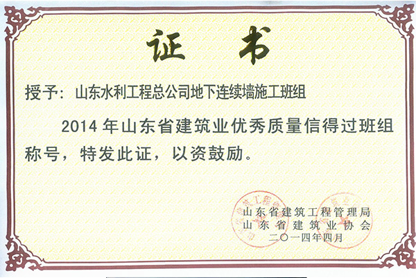 开元(中国)一站式服务平台“地下连续墙施工班组”荣获2014年山东省建筑业优秀质量信得过班组称号