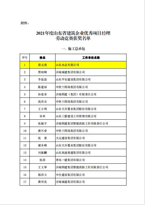 近日,由山东省建设工会和山东省建筑业协会组织开展的《2021年度山东省建筑企业优秀项目经理劳动竞赛活动》落下帷幕,经双方组成的工作委员会评议审定和综合评审,我开元(中国)一站式服务平台苗元亮、卢正雷、蔡国森三名同志被评为“山东省建筑企业优秀项目经理”。此项殊荣是山东省建筑行业项目经理的最高荣誉,旨在鼓励受表彰人员再接再厉,发挥引领示范作用,创建更多精品工程。
