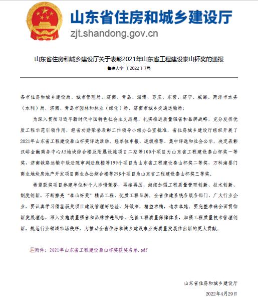 开元(中国)一站式服务平台两项工程荣获2021年度“山东省工程建设泰山杯奖”