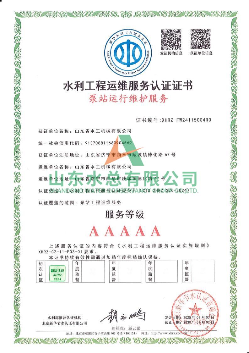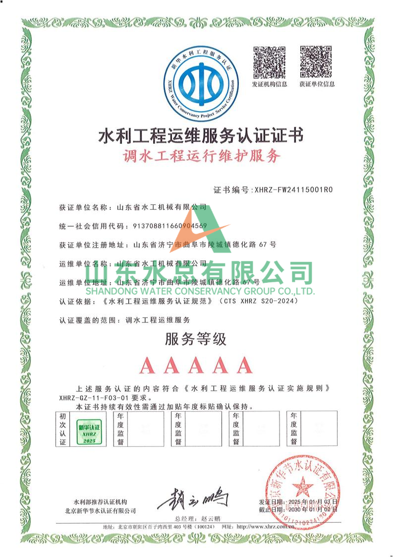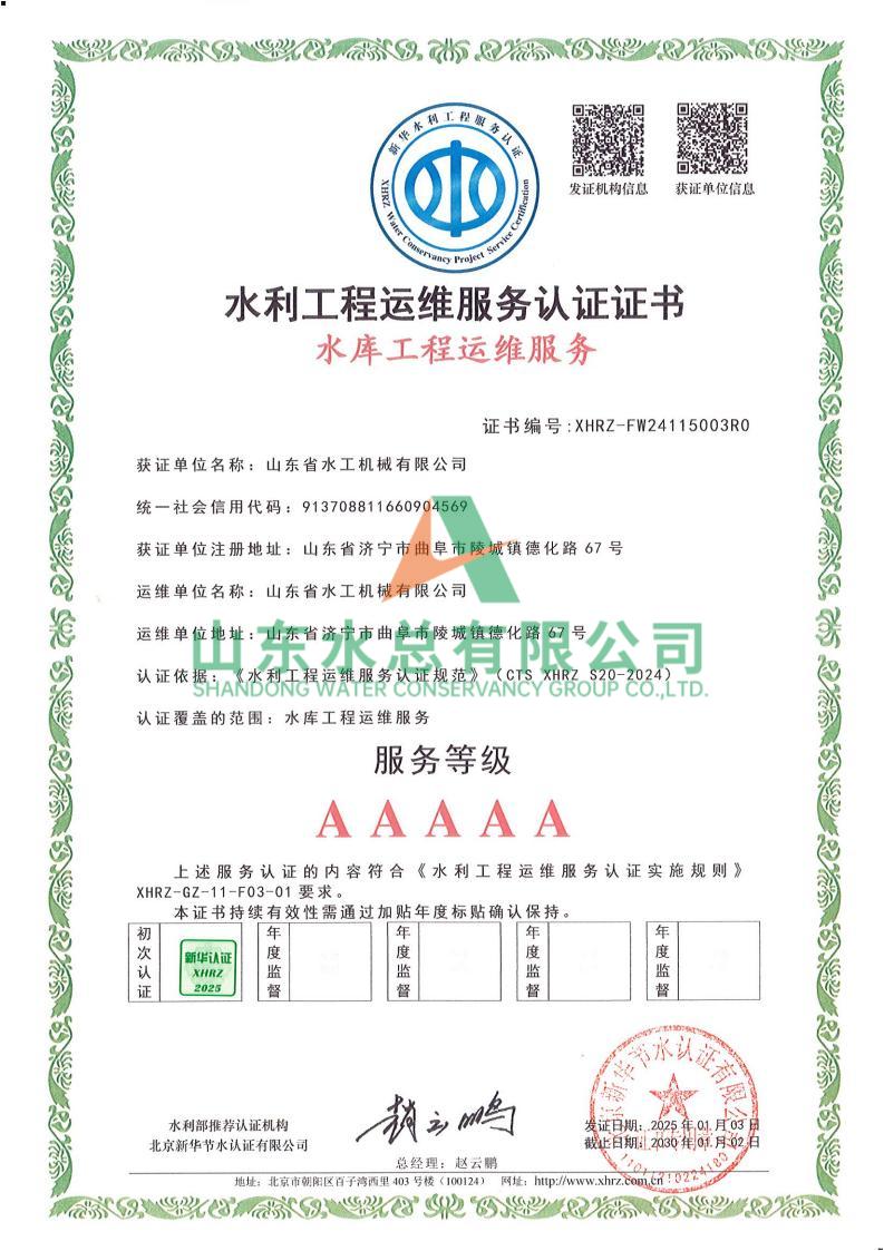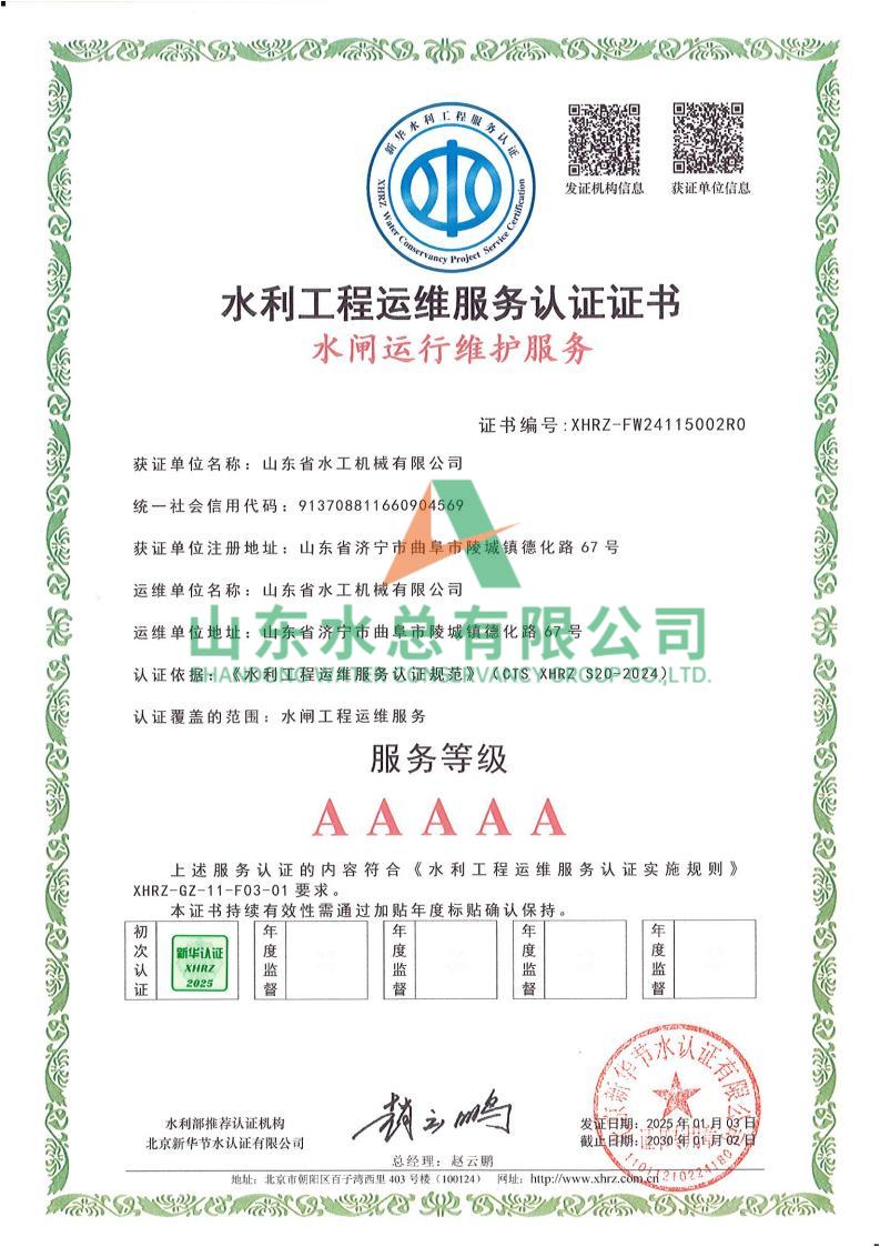 一直以来,水工机械开元(中国)一站式服务平台高度重视水利工程运维服务的质量与专业性,在人员配备、技术应用、管理体系等多方面精心打磨。在认证过程中,历经严格审核,开元(中国)一站式服务平台凭借扎实的运维实力、规范的服务流程以及对水利工程运维高规格的执行标准,赢得了认可。
